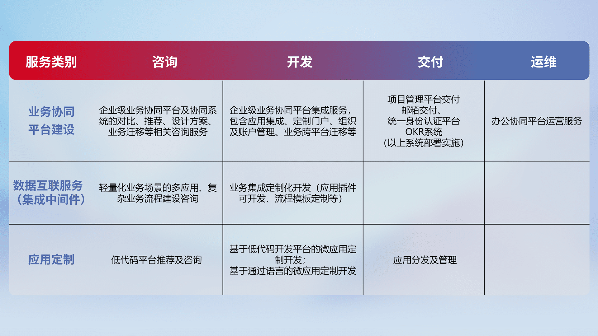 针对钉钉、、企微、、IDaas等平台级产品提供产品的规划、、、方案、、、交付、、定制化开发等服务,,实现如统一协同办公、、智能客户服务、、、混合会议管理、、、、智能数据查询、、、、等业务场景,,实现数字化转型。。。。